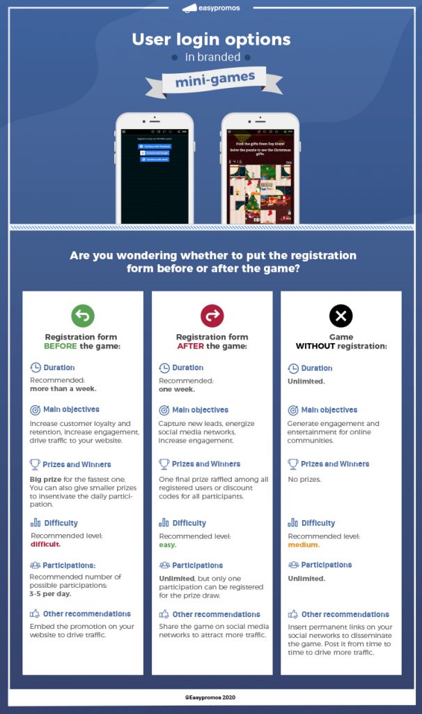 Our games games allow you to decide when you request user information. You can choose to put the form before or after the game, or completely disable the registration form. Bear in mind that by putting the form in one place or another, you not only change but also establish the way users will participate in your promotion. Today, we will take you through the advantages and characteristics of each option. And we hope that by the end of this post you will know which login option is better for you!