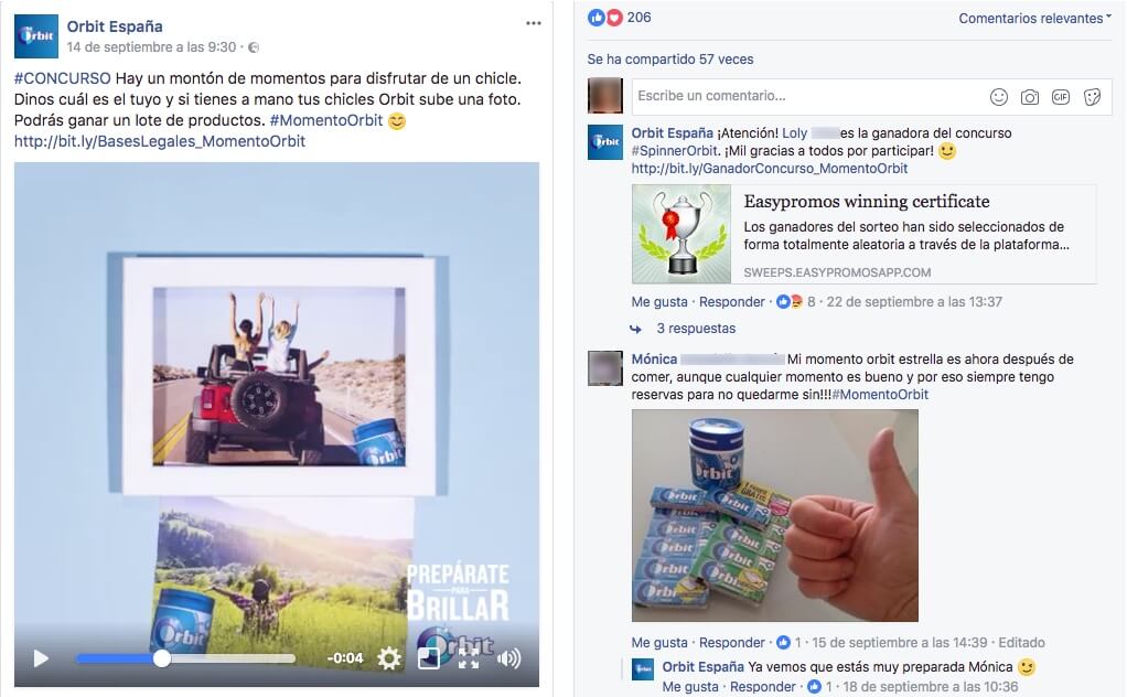 La marca de chicles Orbit presentó un vídeo con momentos para disfrutar de su producto, y pidió a su comunidad que participara en el concurso comentando cuál era su momento favorito. En este caso, se animó a subir una foto en los comentarios con el producto, pero no era obligatorio. Con la nueva funcionalidad, subir una foto puede ser un requisito de exclusión o, sencillamente, una sugerencia para hacer más amena la participación.