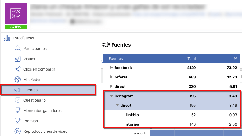 Este enlace (así como todos los que utilizamos en la difusión del concurso) es importante monitorizarlo para saber cuántas visitas a la promoción provienen de esta fuente. Añade parámetros utm al link de la BIO y así sabrás cuántas visitas al concurso vienen de este canal. Es tan fácil como escribir utms con esta fórmula: https://a.cstmapp.com/p/29035/?utm_source=Instagram&utm_medium=linkbio&utm_campaign=concursofotos. Esto te permite registrar esta fuente en la sección «Estadísticas» de tu promoción: