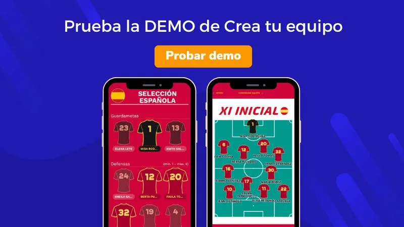 • Propón a los aficionados que se pongan en la piel del entrenador y configuren el once inicial del partido. Incentiva la participación con un buen premio a sortear entre todos los acertantes. Utiliza la aplicación Crea tu equipo y diseña un terreno de juego donde los participantes podrán poner las caras o camisetas de los jugadores. Además, la imagen resultante podrá ser descargada y compartida entre los usuarios, como puedes ver en el siguiente ejemplo.