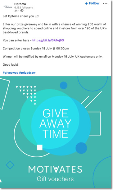 Another professional and highly recommended way to run a contest or giveaway on LinkedIn is to display it on a microsite and share the URL on social media via a post or sponsored post. Check out the following example by Optoma.
