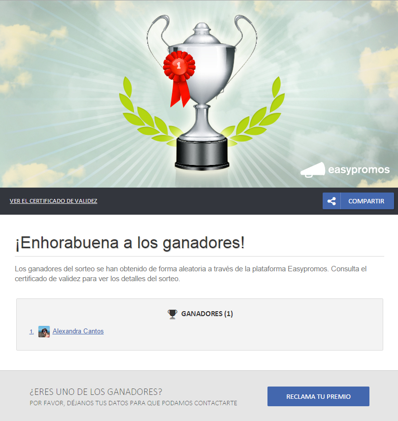 Una vez notificados los ganadores, necesitarás tener sus datos de contacto para poder enviar a cada ganador su premio, lo que es también una de las partes que conlleva más tiempo. Para facilitar este proceso, nuestra plataforma cuenta con el sistema ‘Reclama tu premio’, que permite que los ganadores puedan reclamar su premio y confirmar sus datos, que se enviarán directamente al administrador del sorteo.