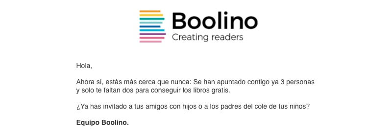 - Plataforma de Emails: Boolino también se apoyó en la Plataforma de Emails para motivar a los participantes y lograr que cumplieran el objetivo de 5 usuarios reclutados, todo con mensajes muy bien trabajados.